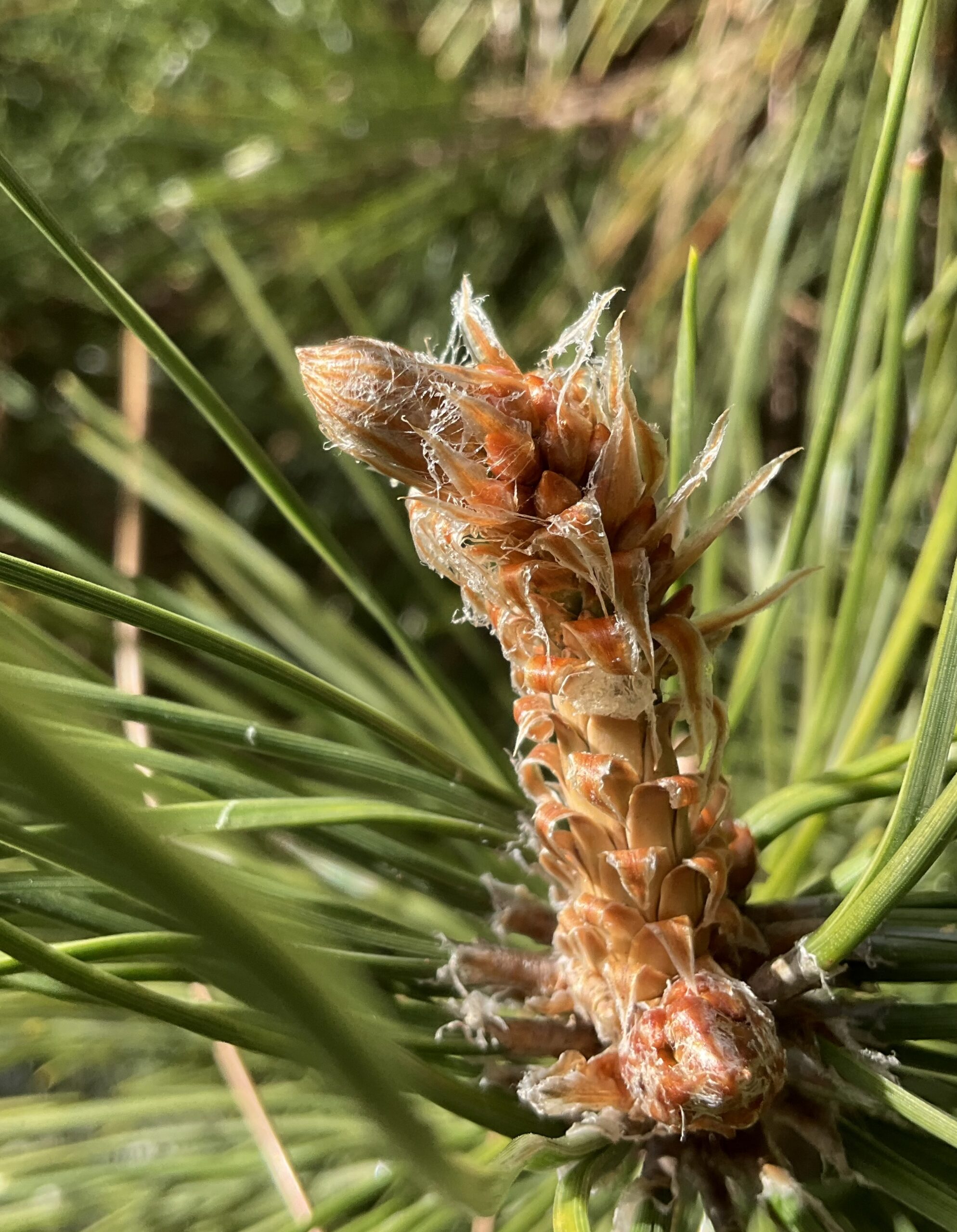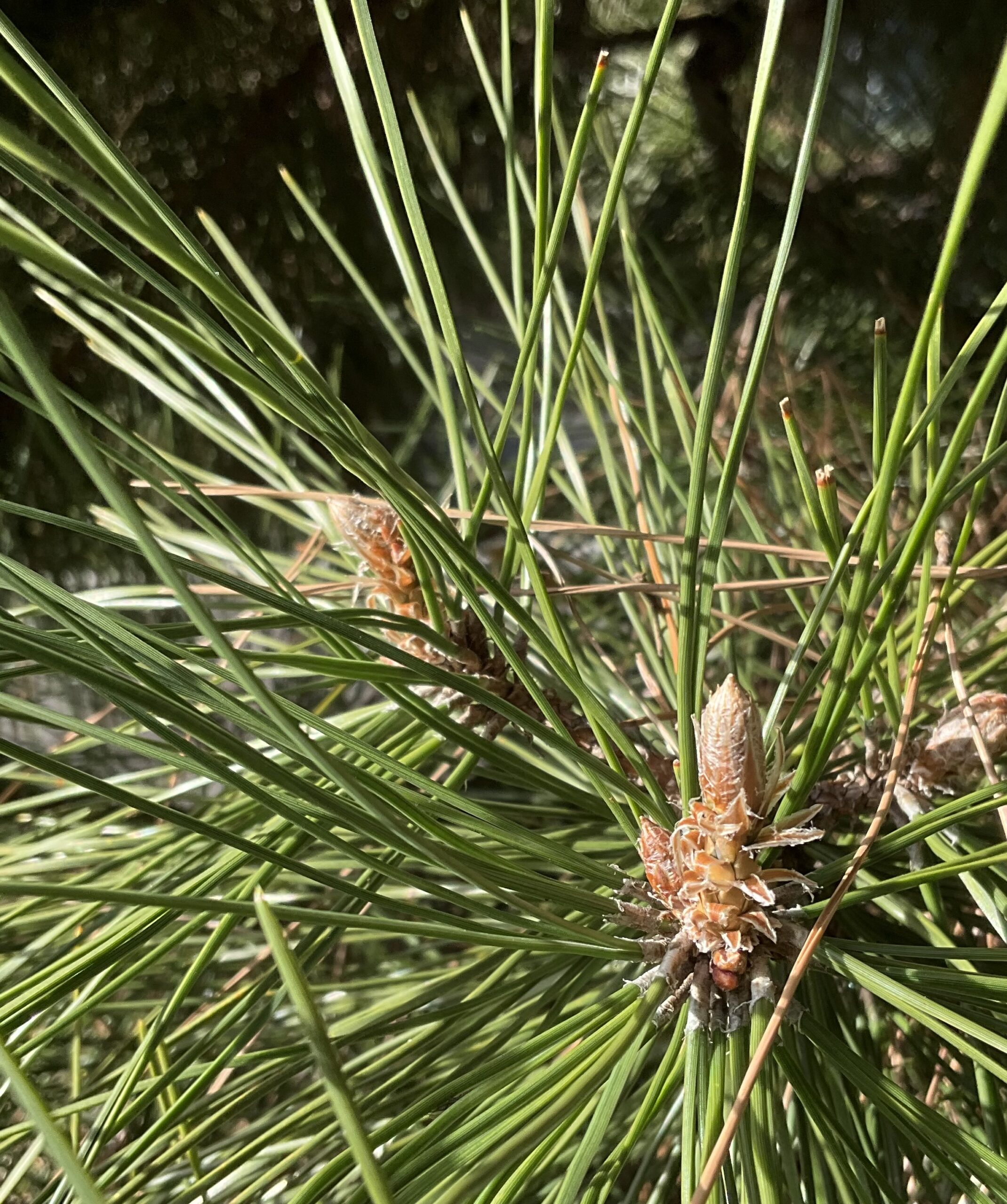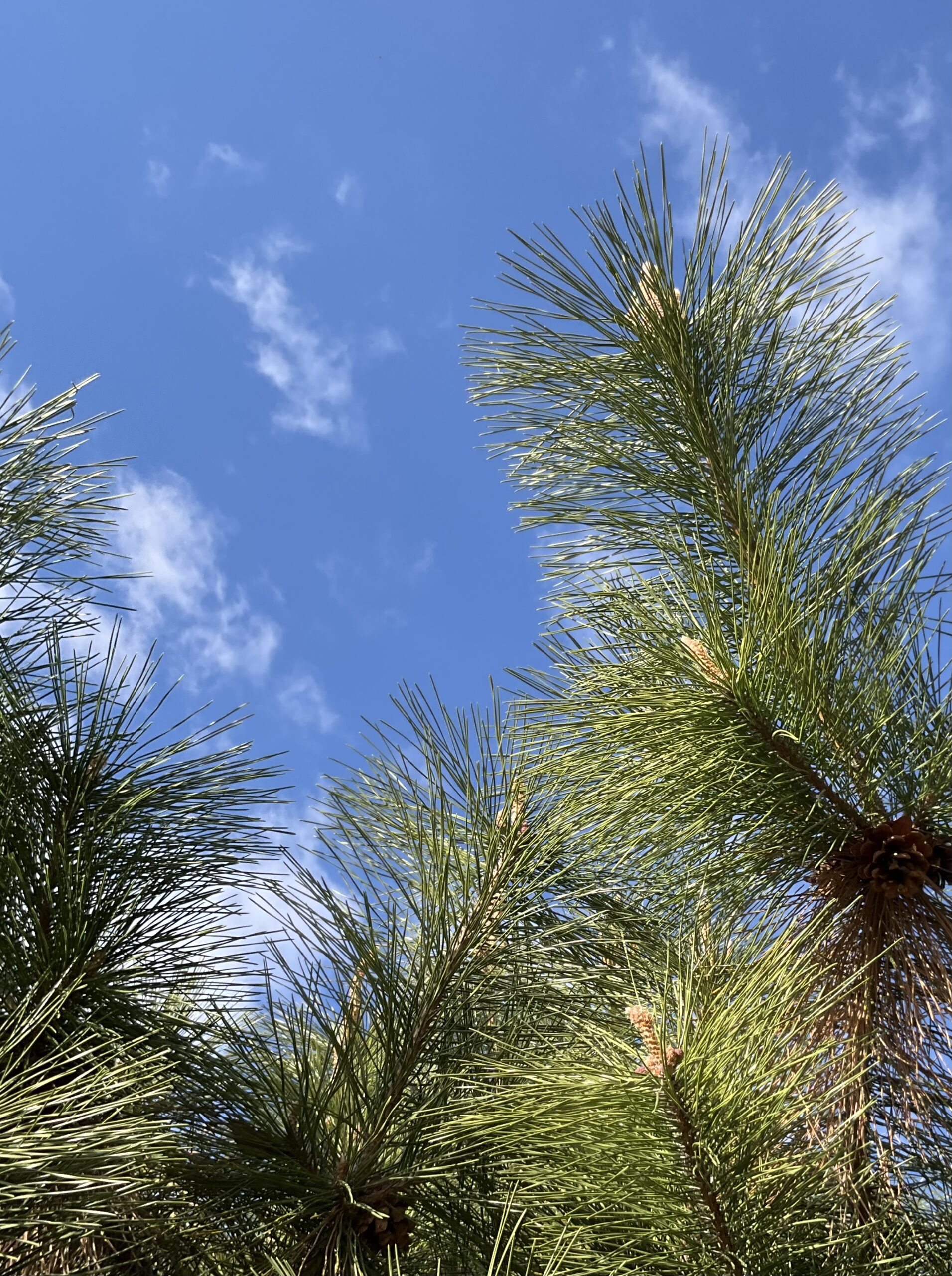 朝の光の中の松にエネルギーを感じる。30年程前の伊豆で、松の落ち葉が積もったような道(松の香が満ちていた)を2時間歩くという体験をした。